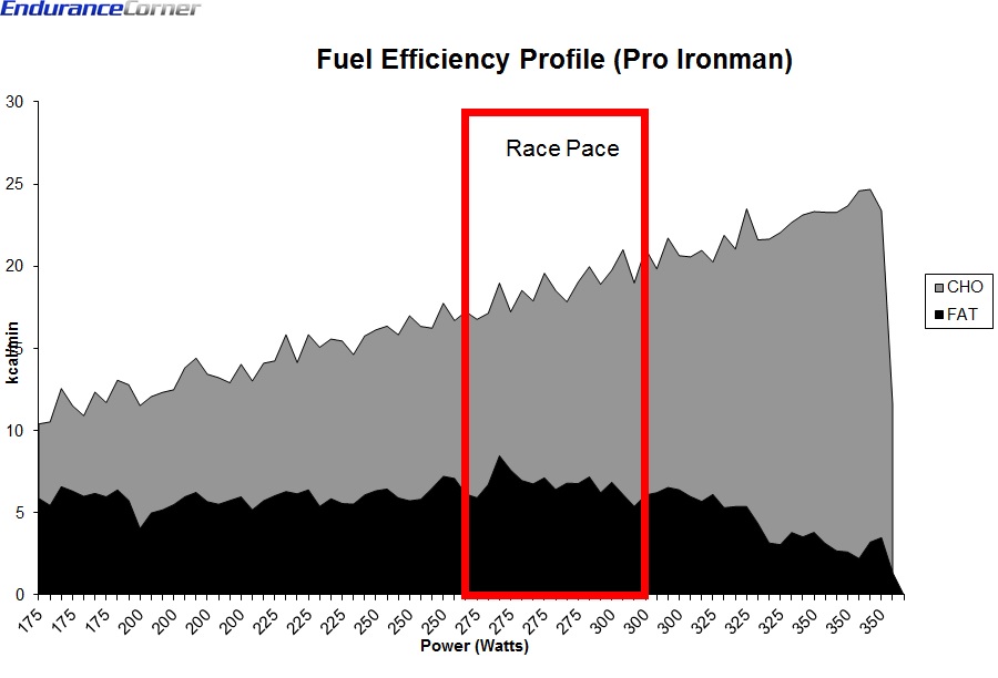 The output for any competitive endurance race, even something as long as an Ironman requires some energy to be generated from carbohydrate oxidation, i.e. aerobic glycolysis. This is because fat oxidation is a fundamentally rate limited process, & while enormous in capacity, it is quite limited in power or rate of energy production. Because of this fact, when we examine the fuel source for high level Ironman output, we consistently find a balanced blend of both fat oxidation and carbohydrate oxidation as shown below in the fuel profile of a high level professional triathlete who specializes in the Ironman distance.