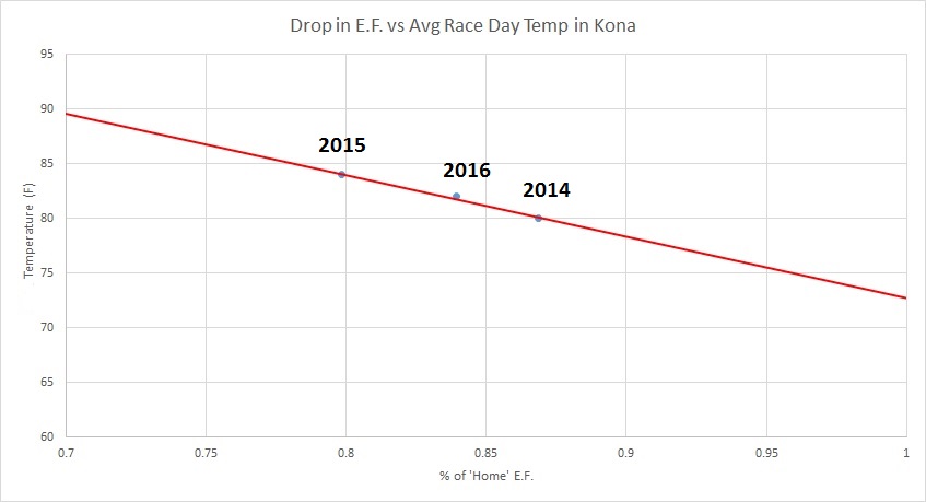 The range across years was 13% in the coolest year (2014), i.e. 87% of the home E.F. training numbers to 20% in the hottest year (2015 - 86 degrees F) with 80% of the home E.F. training numbers.