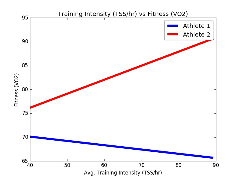 From this, we might conclude athlete 1 is a higher ‘responder’ to training. But, the question remains, what type of training? Let’s take it a step further and look at the trend lines for the impact of the average intensity of the training block on performance